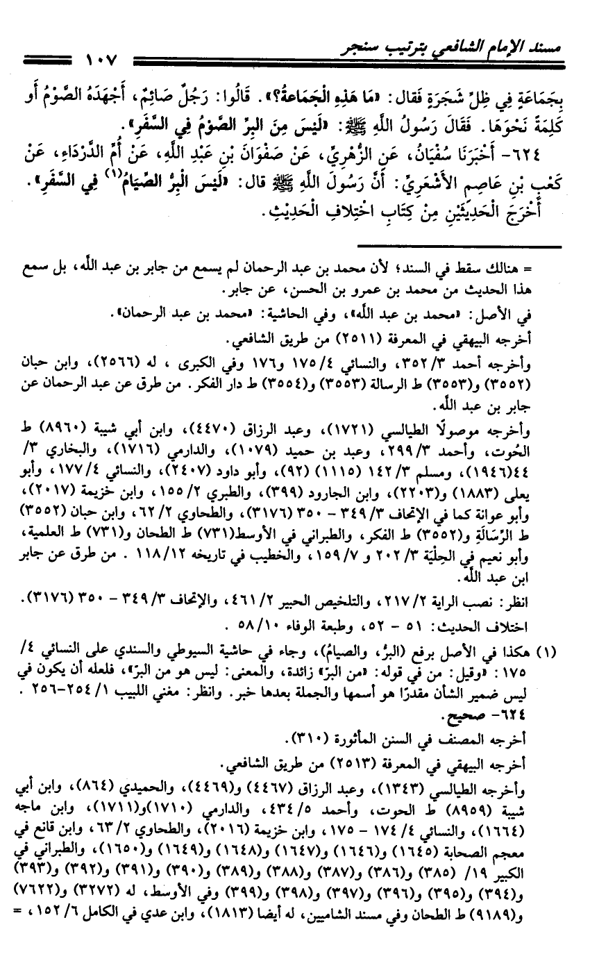 624 - أَخْبَرَنَا سُفْيَانُ، عَنِ الزُّهْرِيِّ، عَنْ صَفْوَان بْنِ عَبْدِ اللَّهِ، عَنْ أُمِّ الدَّرْدَاءِ، عَنْ كَعْبِ بْنِ عَاصِمٍ الأَشْعَرِيِّ: أَنَّ رَسُولَ اللَّهِ صَلَّى اللَّهُ عَلَيْهِ وَسَلَّمَ قَالَ: «لَيْسَ الْبِرُّ الصِّيَامَ فِي السَّفَرِ» .