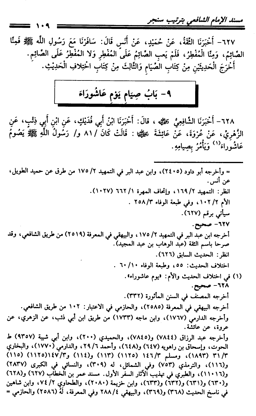 628 - أَخْبَرَنَا الشَّافِعِيُّ رَضِيَ اللَّهُ عَنْهُ، قَالَ: أَخْبَرَنَا ابْنُ أَبِي فُدَيْكٍ، عَنِ ابْنِ أَبِي ذِئْبٍ، عَنِ الزُّهْرِيِّ، عَنْ عُرْوَةَ، عَنْ عَائِشَةَ رَضِيَ اللَّهُ عَنْهَا: قَالَتْ كَانَ رَسُولُ اللَّهِ صَلَّى اللَّهُ عَلَيْهِ وَسَلَّمَ يَصُومُ عَاشُورَاءَ وَيَأْمُرُ بِصِيَامِهِ.