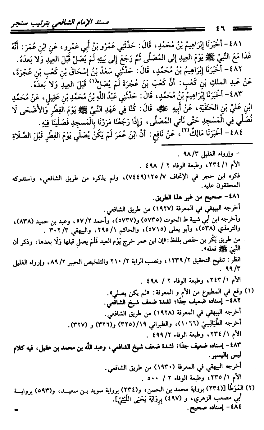 482 - أَخْبَرَنَا إِبْرَاهِيمُ بْنُ مُحَمَّدٍ، قَالَ: حَدَّثَنِي سَعْدُ بْنُ إِسْحَاقَ بْنِ كَعْبِ بْنِ عُجْرَةَ، عَنْ عَبْدِ الْمَلِكِ بْنِ كَعْبٍ: أَنَّ كَعْبَ بْنَ عُجْرَةَ لَمْ يُصَلِّ قَبْلَ الْعِيدِ وَلا بَعْدَهُ.
