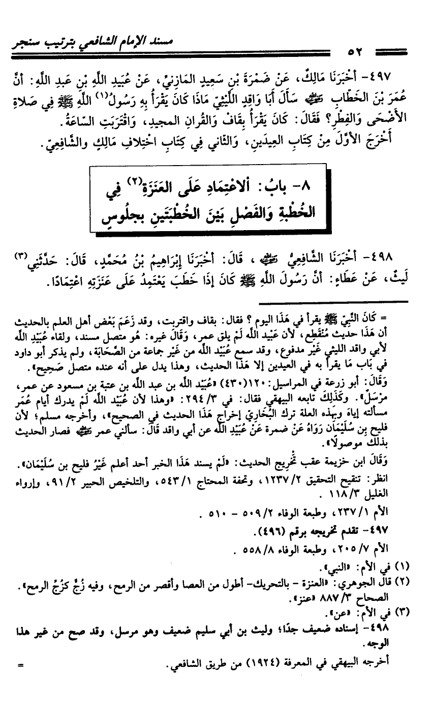 498 - أَخْبَرَنَا الشَّافِعِيُّ رَضِيَ اللَّهُ عَنْهُ، قَالَ: أَخْبَرَنَا إِبْرَاهِيمُ بْنُ مُحَمَّدٍ، قَالَ: حَدَّثَنِي لَيْثٌ، عَنْ عَطَاءٍ: أَنَّ رَسُولَ اللَّهِ صَلَّى اللَّهُ عَلَيْهِ وَسَلَّمَ كَانَ إِذَا خَطَبَ يَعْتَمِدُ عَلَى عَنَزَتِهِ اعْتِمَادًا.