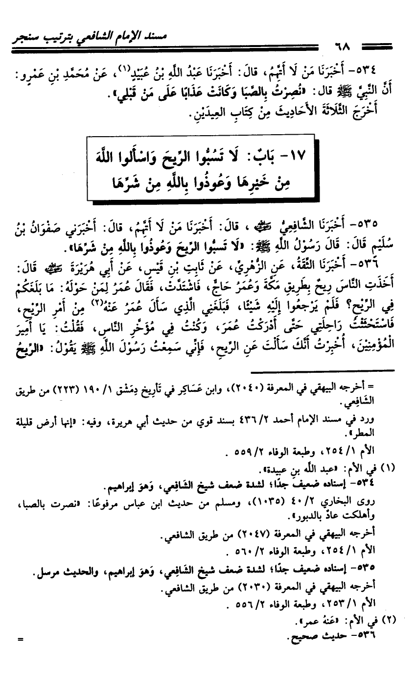 535 - أَخْبَرَنَا الشَّافِعِيُّ رَضِيَ اللَّهُ عَنْهُ، قَالَ: أَخْبَرَنَا مَنْ لا أَتَّهِمُ، قَالَ: أَخْبَرَنِي صَفْوَانُ بْنُ سُلَيْمٍ، قَالَ: قَالَ رَسُولُ اللَّهِ صَلَّى اللَّهُ عَلَيْهِ وَسَلَّمَ: «لا تَسَبُّوا الرِّيحَ وَعُوذُوا بِاللَّهِ مِنْ شَرِّهَا» .