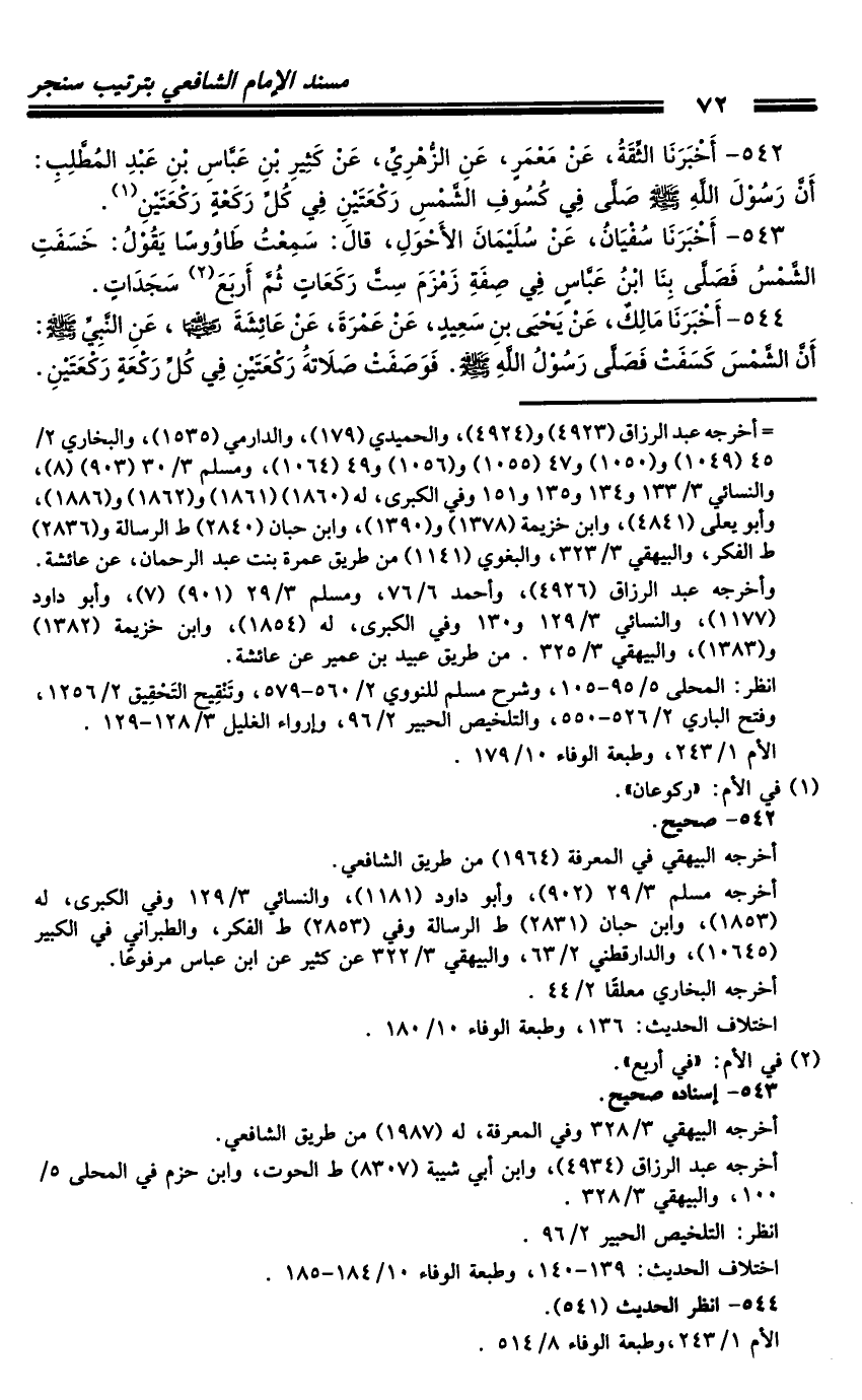 542 - أَخْبَرَنَا الثِّقَةُ، عَنْ مَعْمَرٍ، عَنِ الزُّهْرِيِّ، عَنْ كَثِيرِ بْنِ عَبَّاسِ بْنِ عَبْدِ الْمُطَّلِبِ: أَنَّ رَسُولَ اللَّهِ صَلَّى اللَّهُ عَلَيْهِ وَسَلَّمَ صَلَّى فِي كُسُوفِ الشَّمْسِ رَكْعَتَيْنِ فِي كُلِّ رَكْعَةٍ رَكْعَتَيْنِ.