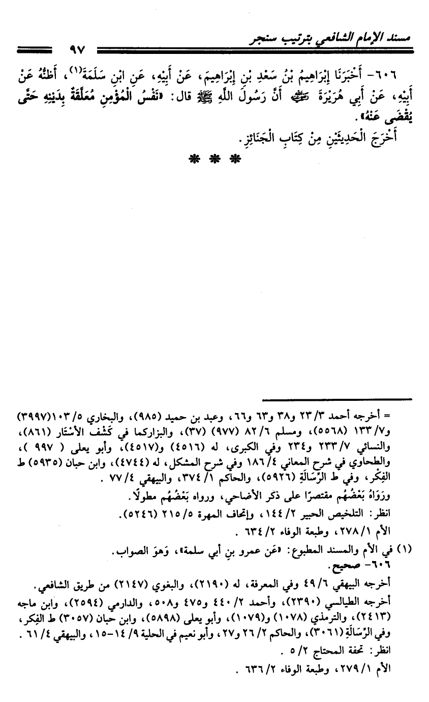 606 - أَخْبَرَنَا إِبْرَاهِيمُ بْنُ سَعْدِ بْنِ إِبْرَاهِيمَ، عَنْ أَبِيهِ، عَنِ ابْنِ سَلَمَةَ، أَظُنُّهُ عَنْ أَبِيهِ، عَنْ أَبِي هُرَيْرَةَ رَضِيَ اللَّهُ عَنْهُ، أَنَّ رَسُولَ اللَّهِ صَلَّى اللَّهُ عَلَيْهِ وَسَلَّمَ قَالَ: «نَفْسُ الْمُؤْمِنِ مُعَلَّقَةٌ بِدَيْنِهِ حَتَّى يُقْضَى عَنْهُ» .