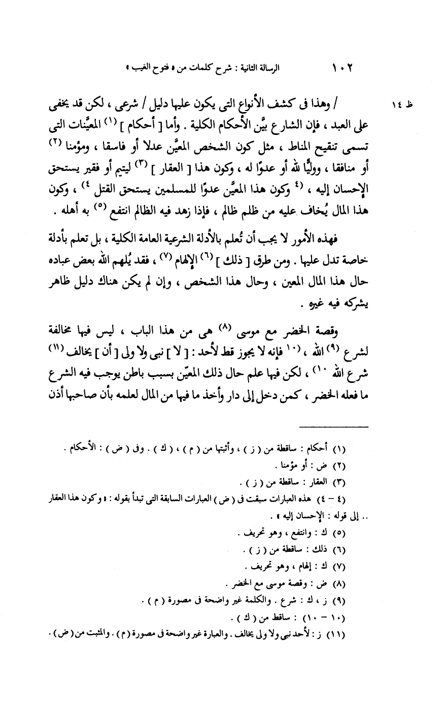 وقصة الْخضر مَعَ مُوسَى هِيَ من هَذَا الْبَاب لَيْسَ فِيهَا مُخَالفَة لشرع الله؛ فَإِنَّهُ لَا يجوز قطّ لأحد لَا نَبِي وَلَا ولي أَن يُخَالف شرع الله لَكِن فِيهَا علم حَال ذَاك الْمعِين بِسَبَب بَاطِن يُوجب فِيهِ الشَّرْع مَا فعله الْخضر، كمن دخل إِلَى دَار وَأخذ مَا فِيهَا من المَال لعلمه بِأَن صَاحبهَا أذن