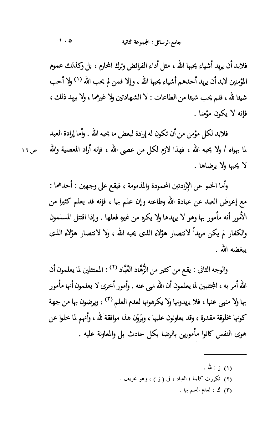 فَلَا بُد لكل مُؤمن من أَن تكون لَهُ إِرَادَة لبَعض مَا يُحِبهُ الله؛ وَأما إِرَادَة العَبْد لما يهواه وَلَا يُحِبهُ الله فَهَذَا لَازم لكل من عصى الله فَإِنَّهُ أَرَادَ الْمعْصِيَة وَالله لَا يُحِبهَا وَلَا يرضاها.