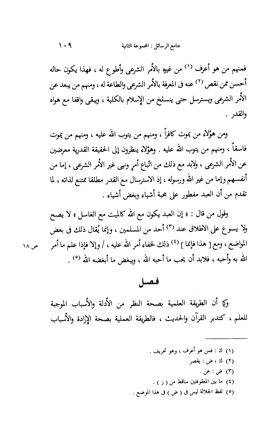فَمنهمْ من هُوَ أعرف من غَيره بِالْأَمر الشَّرْعِيّ وأطوع لَهُ فَهَذَا تكون حَاله أحسن مِمَّن نقص عَنهُ فِي الْمعرفَة بِالْأَمر الشَّرْعِيّ وَالطَّاعَة لَهُ. وَمِنْهُم من يبعد عَن الْأَمر الشَّرْعِيّ ويسترسل حَتَّى يَنْسَلِخ من الْإِسْلَام بِالْكُلِّيَّةِ وَيبقى وَاقِفًا مَعَ هَوَاهُ وَالْقدر.