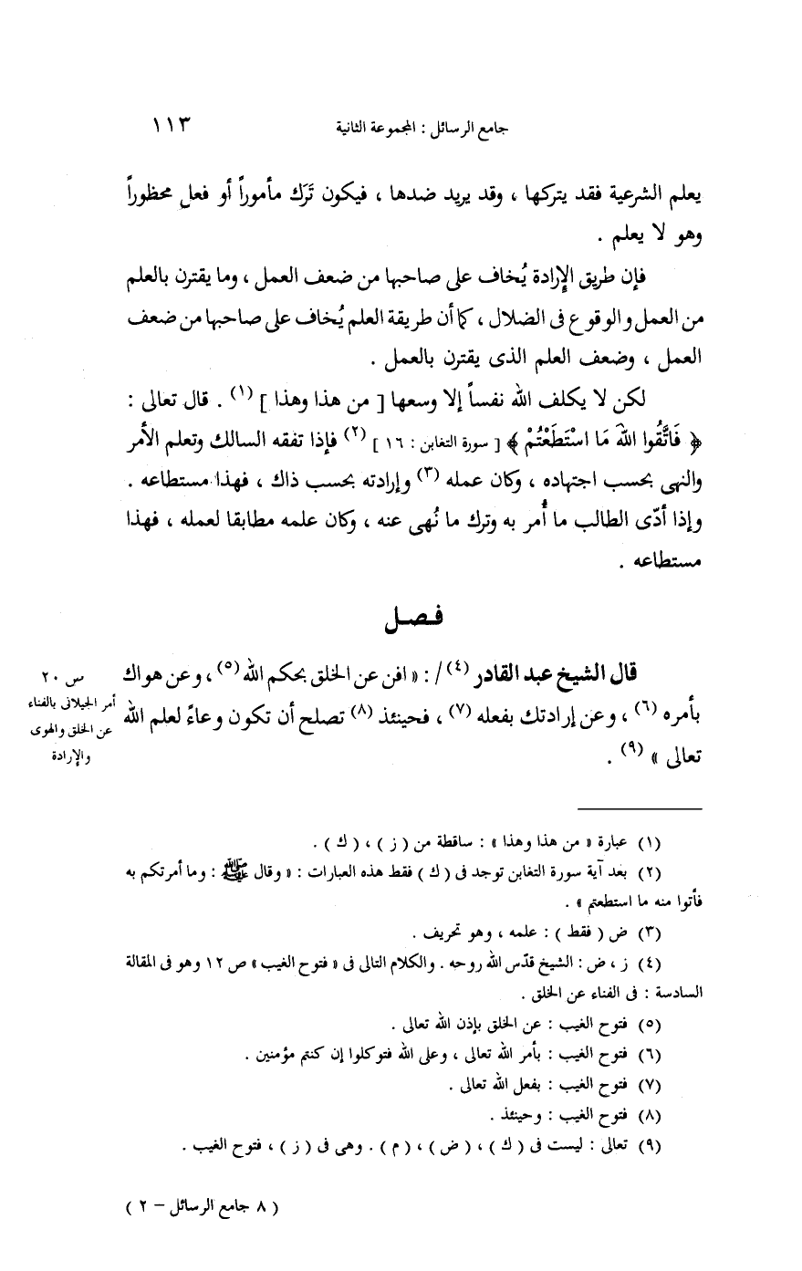 قَالَ الشَّيْخ عبد الْقَادِر: " افن عَن الْخلق بِحكم الله، وَعَن هَوَاك بأَمْره، وَعَن إرادتك بِفِعْلِهِ، فَحِينَئِذٍ تصلح أَن تكون وعَاء لعلم الله تَعَالَى ".