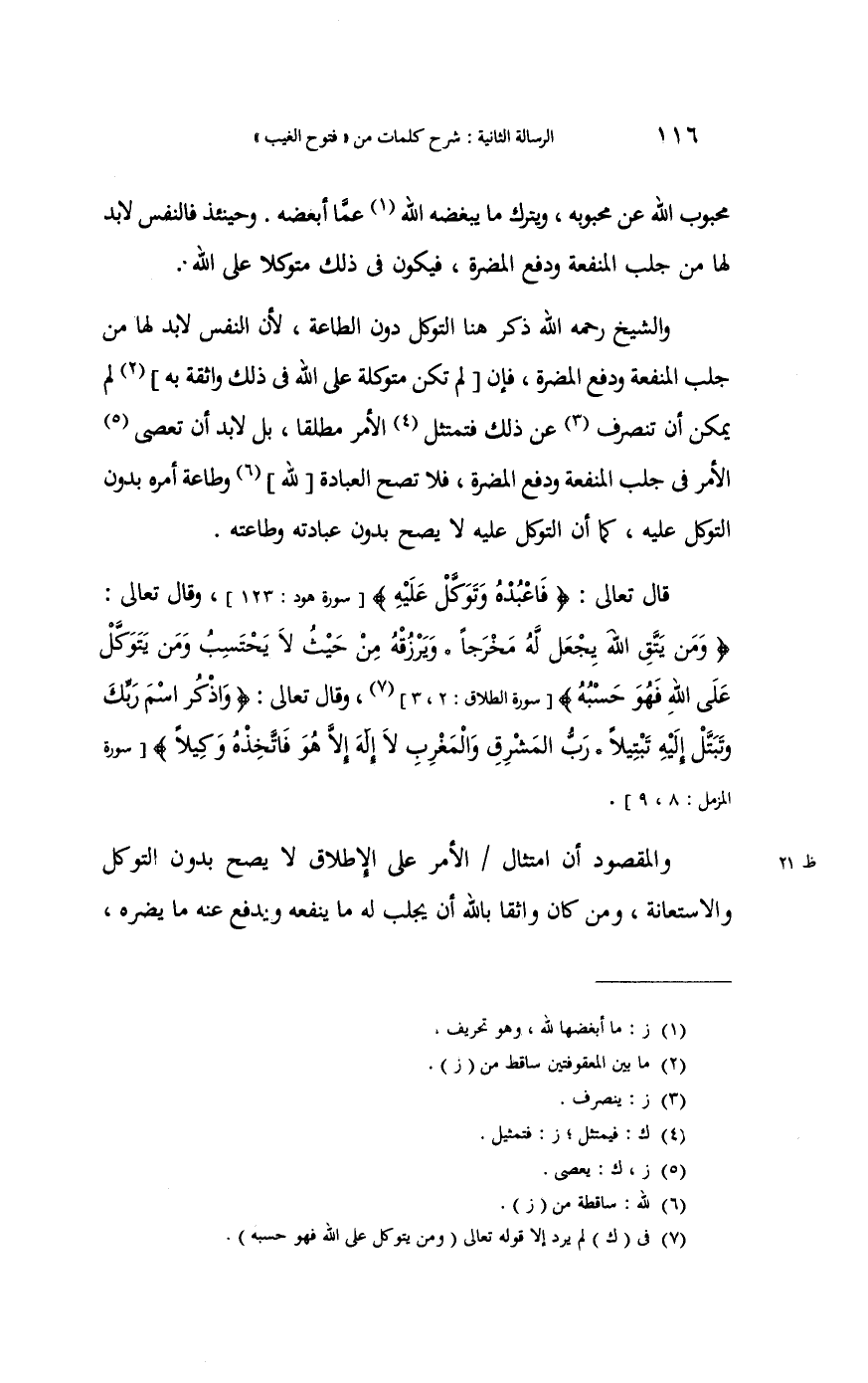 و (الْمَقْصُود) أَن امْتِثَال الْأَمر على الْإِطْلَاق لَا يَصح بِدُونِ التَّوَكُّل والاستعانة وَمن كَانَ واثقا بِاللَّه أَن يجلب لَهُ مَا يَنْفَعهُ وَيدْفَع عَنهُ مَا يضرّهُ