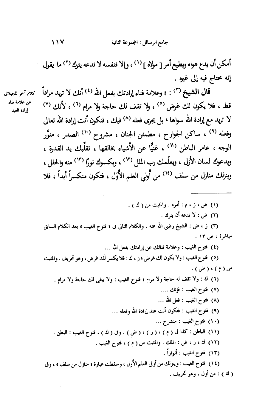 قَالَ الشَّيْخ: " وعلامة فنَاء إرادتك بِفعل الله أَنَّك لَا تُرِيدُ مرَادا قطّ فَلَا يكن لَك غَرَض وَلَا تقف لَك حَاجَة وَلَا مرام؛ لِأَنَّك لَا تُرِيدُ مَعَ إِرَادَة الله سواهَا بل يجْرِي فعله فِيك فَتكون أَنْت إِرَادَة الله تَعَالَى وَفعله، سَاكن الْجَوَارِح، مطمئن الْجنان، مشروح الصَّدْر، منور الْوَجْه، عَامر الْبَاطِن، غَنِيا عَن الْأَشْيَاء بخالقها تقلبك يَد الْقُدْرَة، ويدعوك لِسَان الْأَزَل، ويعلمك رب الْملَل ويكسوك نورا مِنْهُ وَالْحلَل، وينزلك منَازِل من سلف من أولي الْعلم الأول فَتكون منكسرا أبدا، فَلَا