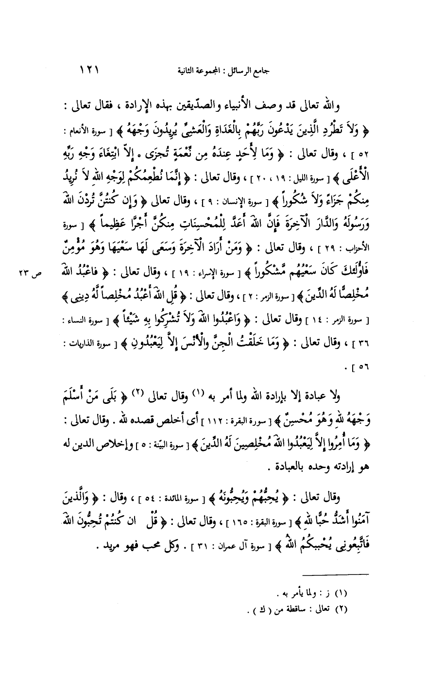 وَالله تَعَالَى قد وصف الْأَنْبِيَاء وَالصديقين بِهَذِهِ " الْإِرَادَة " فَقَالَ تَعَالَى: {وَلَا تطرد الَّذين يدعونَ رَبهم بِالْغَدَاةِ والعشي يُرِيدُونَ وَجهه} وَقَالَ تَعَالَى: {وَمَا لأحد عِنْده من نعْمَة تجزى} {إِلَّا ابْتِغَاء وَجه ربه الْأَعْلَى} وَقَالَ تَعَالَى: {إِنَّمَا نطعمكم لوجه الله لَا نُرِيد مِنْكُم جَزَاء وَلَا شكُورًا} وَقَالَ تَعَالَى: {وَإِن كنتن تردن الله وَرَسُوله وَالدَّار الْآخِرَة فَإِن الله أعد للمحسنات مِنْكُن أجرا عَظِيما} وَقَالَ تَعَالَى: {وَمن أَرَادَ الْآخِرَة وسعى لَهَا سعيها وَهُوَ مُؤمن فَأُولَئِك كَانَ سَعْيهمْ مشكورا} وَقَالَ تَعَالَى: {فاعبد الله مخلصا لَهُ الدَّين} {أَلا لله الدَّين الْخَالِص} وَقَالَ تَعَالَى: {قل الله أعبد مخلصا لَهُ ديني} وَقَالَ تَعَالَى: {واعبدوا الله وَلَا تُشْرِكُوا بِهِ شَيْئا} وَقَالَ تَعَالَى: {وَمَا خلقت الْجِنّ وَالْإِنْس إِلَّا ليعبدون} .