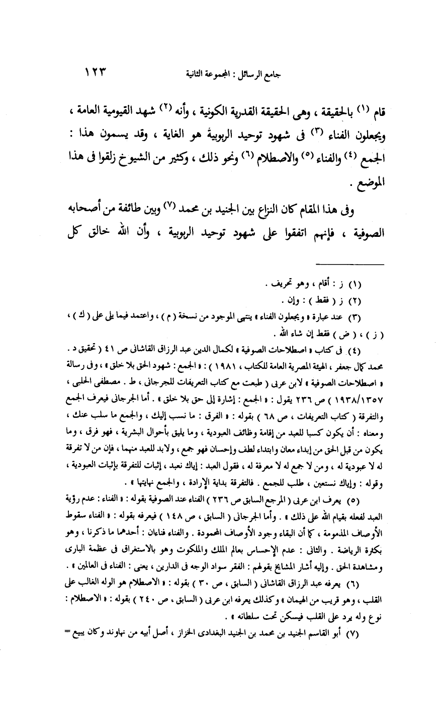 وَفِي " هَذَا الْمقَام " كَانَ النزاع بَين الْجُنَيْد بن مُحَمَّد وَبَين طَائِفَة من أَصْحَابه الصُّوفِيَّة؛ فَإِنَّهُم اتَّفقُوا على شُهُود تَوْحِيد الربوبية وَأَن الله خَالق كل