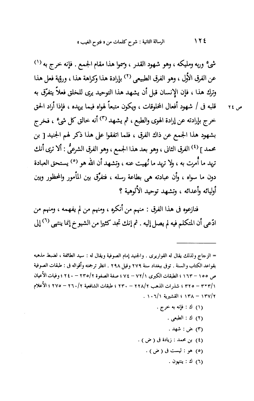 شَيْء وربه ومليكه وَهُوَ شُهُود الْقدر؛ وَسموا هَذَا " مقَام الْجمع " فَإِنَّهُ خرج بِهِ عَن الْفرق الأول وَهُوَ الْفرق الطبيعي بِإِرَادَة هَذَا وَكَرَاهَة هَذَا، ورؤية فعل هَذَا وَترك هَذَا فَإِن الْإِنْسَان قبل أَن يشْهد هَذَا التَّوْحِيد يرى لِلْخلقِ فعلا يتفرق بِهِ قلبه فِي شُهُود أَفعَال الْمَخْلُوقَات؛ وَيكون مُتبعا لهواه فِيمَا يُريدهُ فَإِذا أَرَادَ الْحق خرج بإرادته عَن إِرَادَة الْهوى والطبع ثمَّ يشْهد أَنه خَالق كل شَيْء فَخرج بِشُهُود هَذَا الْجمع عَن ذَاك الْفرق فَلَمَّا اتَّفقُوا على هَذَا ذكر لَهُم الْجُنَيْد بن مُحَمَّد " الْفرق الثَّانِي " وَهُوَ بعد هَذَا الْجمع وَهُوَ الْفرق الشَّرْعِيّ. أَلا ترى أَنَّك تُرِيدُ مَا أمرت بِهِ وَلَا تُرِيدُ مَا نهيت عَنهُ وَتشهد أَن الله هُوَ يسْتَحق الْعِبَادَة دون مَا سواهُ وَأَن عِبَادَته هِيَ بِطَاعَة رسله فَتفرق بَين الْمَأْمُور والمحظور وَبَين أوليائه وأعدائه، وَتشهد تَوْحِيد الألوهية؟