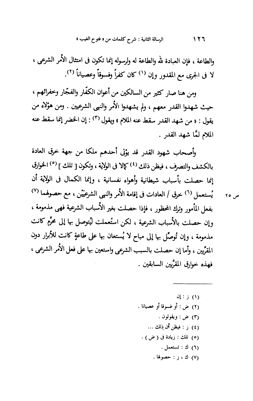 وَأَصْحَاب شُهُود الْقدر قد يُؤْتى أحدهم ملكا من جِهَة خرق الْعَادة بالكشف وَالتَّصَرُّف فيظن ذَلِك كمالا فِي الْولَايَة؛ وَتَكون تِلْكَ " الخوارق " إِنَّمَا حصلت بِأَسْبَاب شيطانية وَأَهْوَاء نفسانية؛ وَإِنَّمَا الْكَمَال فِي الْولَايَة أَن يسْتَعْمل خرق الْعَادَات فِي إِقَامَة الْأَمر وَالنَّهْي الشرعيين مَعَ حصولهما بِفعل الْمَأْمُور وَترك الْمَحْظُور فَإِذا حصلت بِغَيْر الْأَسْبَاب الشَّرْعِيَّة فَهِيَ مذمومة وَإِن حصلت بالأسباب الشَّرْعِيَّة لَكِن اسْتعْملت ليتوصل بهَا إِلَى محرم كَانَت مذمومة وَإِن توصل بهَا إِلَى مُبَاح لَا يستعان بهَا على طَاعَة كَانَت للأبرار دون المقربين وَأما إِن حصلت بِالسَّبَبِ الشَّرْعِيّ واستعين بهَا على فعل الْأَمر الشَّرْعِيّ: فَهَذِهِ خوارق المقربين السَّابِقين.