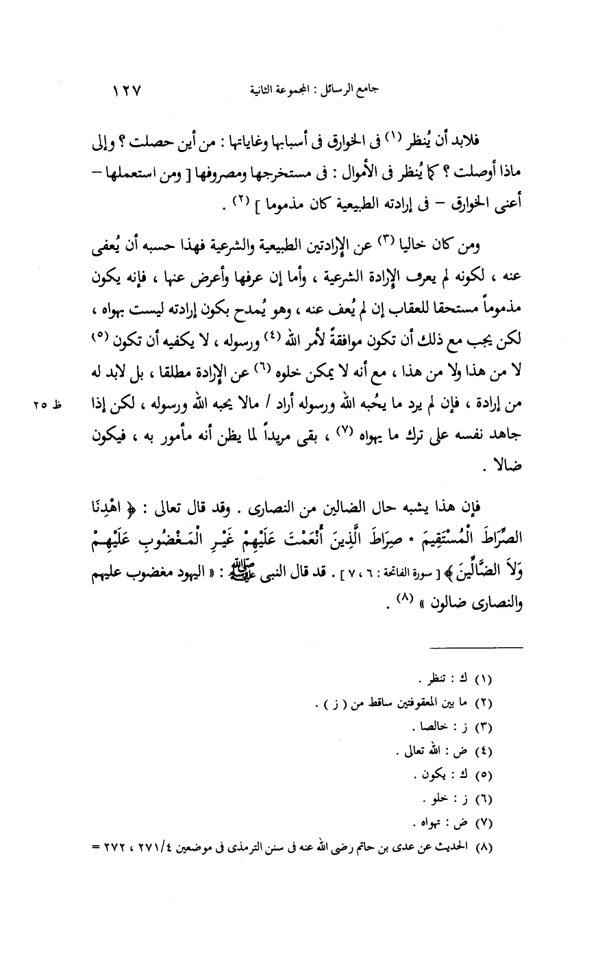 وَمن كَانَ خَالِيا عَن الإرادتين الطبيعية والشرعية فَهَذَا حَسبه أَن يُعْفَى عَنهُ لكَونه لم يعرف الْإِرَادَة الشَّرْعِيَّة. وَأما إِن عرفهَا وَأعْرض عَنْهَا فَإِنَّهُ يكون مذموما مُسْتَحقّا للعقاب إِن لم يعف عَنهُ وَهُوَ يمدح بِكَوْن إِرَادَته لَيست بهواه؛ لَكِن يجب مَعَ ذَلِك أَن تكون مُوَافقَة لأمر الله وَرَسُوله لَا يَكْفِيهِ أَن تكون لَا من هَذَا وَلَا من هَذَا مَعَ أَنه لَا يُمكن خلوه عَن الْإِرَادَة مُطلقًا بل لَا بُد لَهُ من إِرَادَة فَإِن لم يرد مَا يُحِبهُ الله وَرَسُوله أَرَادَ مَا لَا يُحِبهُ الله وَرَسُوله؛ لَكِن إِذا جَاهد نَفسه على ترك مَا يهواه بَقِي مرِيدا لما يظنّ أَنه مَأْمُور بِهِ فَيكون ضَالًّا.