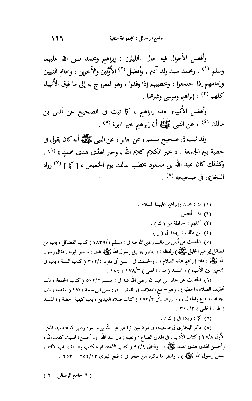 وَأفضل الْأَنْبِيَاء بعده " إِبْرَاهِيم " كَمَا ثَبت فِي الصَّحِيح عَن أنس عَن النَّبِي صلى الله عَلَيْهِ وَسلم " {أَن إِبْرَاهِيم خير الْبَريَّة} ".