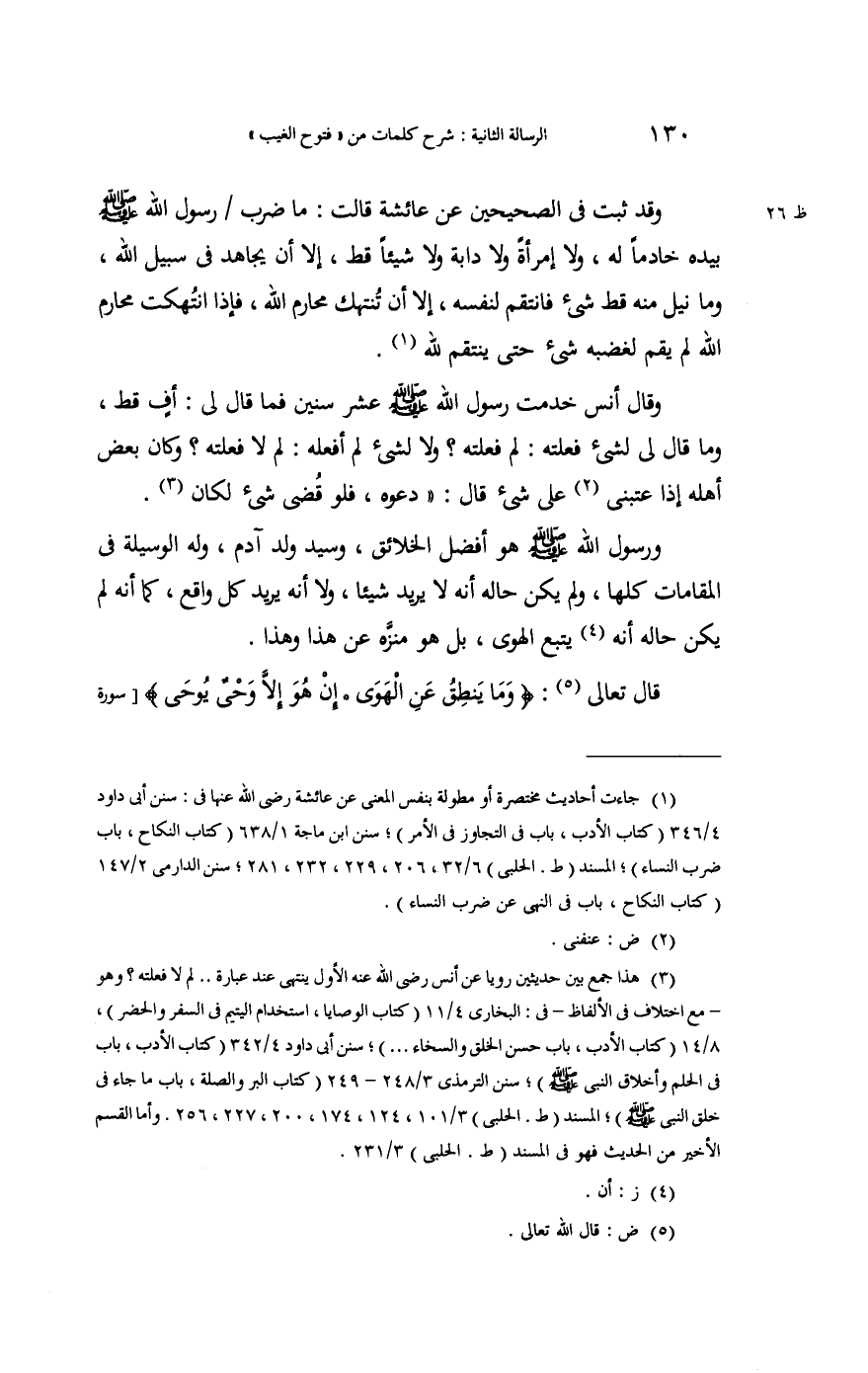 وَقد ثَبت فِي الصَّحِيحَيْنِ عَن عَائِشَة رَضِي الله عَنْهَا أَنَّهَا قَالَت: " {مَا ضرب رَسُول الله صلى الله عَلَيْهِ وَسلم خَادِمًا لَهُ وَلَا امْرَأَة وَلَا دَابَّة وَلَا شَيْئا قطّ إِلَّا أَن يُجَاهد فِي سَبِيل الله وَمَا نيل مِنْهُ قطّ شَيْء فانتقم لنَفسِهِ إِلَّا أَن تنتهك محارم الله فَإِذا انتهكت محارم الله لم يقم لغضبه شَيْء حَتَّى ينْتَقم لله} ".