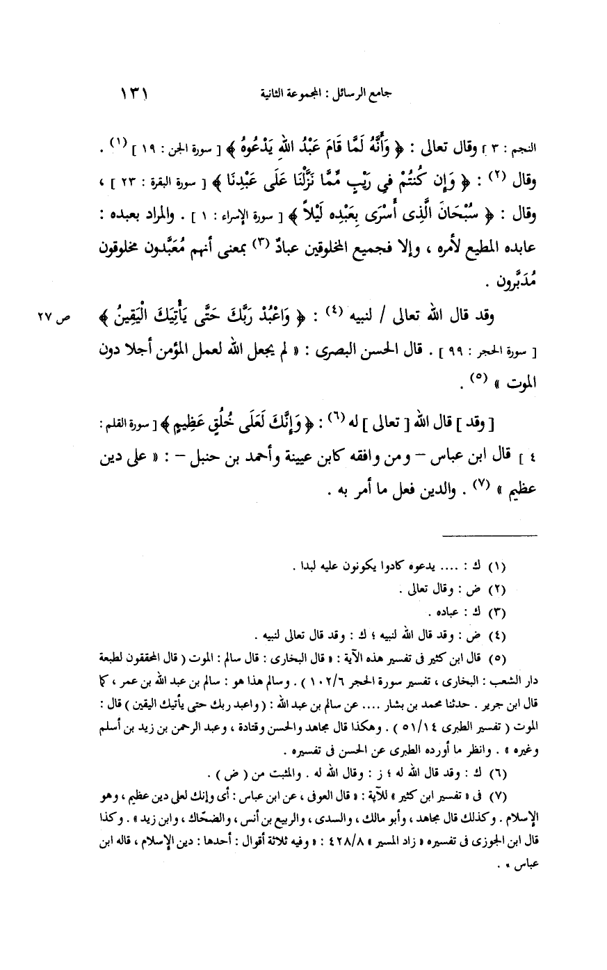 وَقد قَالَ الله تَعَالَى لنَبيه: {واعبد رَبك حَتَّى يَأْتِيك الْيَقِين} قَالَ الْحسن الْبَصْرِيّ لم يَجْعَل الله لعمل الْمُؤمن أَََجَلًا دون الْمَوْت.