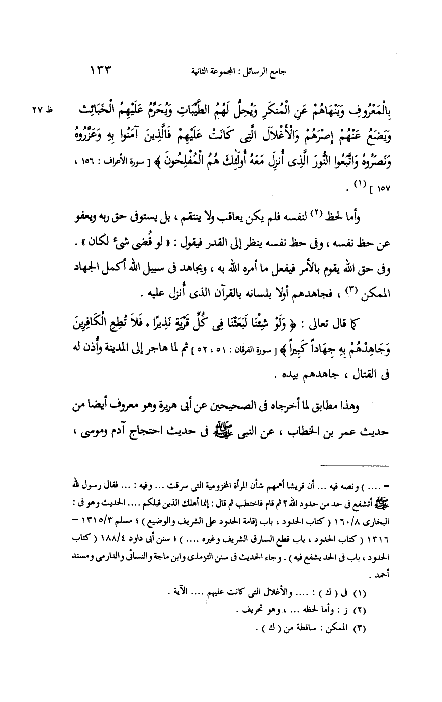 وَأما لحظ نَفسه فَلم يكن يُعَاقب وَلَا ينْتَقم بل يَسْتَوْفِي حق ربه، وَيَعْفُو عَن حَظّ نَفسه وَفِي حَظّ نَفسه ينظر إِلَى الْقدر. فَيَقُول: " {لَو قضي شَيْء لَكَانَ} " وَفِي حق الله يقوم بِالْأَمر فيفعل مَا أَمر الله بِهِ ويجاهد فِي سَبِيل الله أكمل الْجِهَاد الْمُمكن فجاهدهم أَولا بِلِسَانِهِ بِالْقُرْآنِ الَّذِي أنزل عَلَيْهِ.