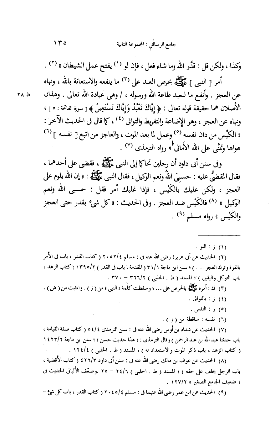 وَفِي سنَن أبي دَاوُد: " {أَن رجلَيْنِ تحاكما إِلَى النَّبِي صلى الله عَلَيْهِ وَسلم فَقضى على أَحدهمَا. فَقَالَ الْمقْضِي عَلَيْهِ: حسبي الله وَنعم الْوَكِيل فَقَالَ النَّبِي صلى الله عَلَيْهِ وَسلم إِن الله يلوم على الْعَجز وَلَكِن عَلَيْك بالكيس فَإِذا غلبك أَمر فَقل: حسبي الله وَنعم الْوَكِيل} " فالكيس ضد الْعَجز. وَفِي الحَدِيث: " {كل شَيْء بِقدر حَتَّى الْعَجز والكيس} " رَوَاهُ مُسلم.
