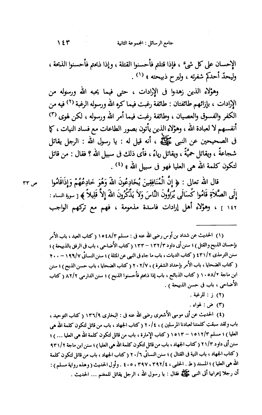 وَهَؤُلَاء الَّذين زهدوا فِي " الإرادات " حَتَّى فِيمَا يُحِبهُ الله وَرَسُوله من الإرادات بإزائهم " طَائِفَتَانِ ": (طَائِفَة رغبت فِيمَا كره الله وَرَسُوله والرَّغْبَة فِيهِ من الْكفْر والفسوق والعصيان) . و (طَائِفَة رغبت فِيمَا أَمر الله وَرَسُوله لَكِن لهوى أنفسهم لَا لعبادة الله تَعَالَى) وَهَؤُلَاء الَّذين يأْتونَ بصور الطَّاعَات مَعَ فَسَاد النيات كَمَا فِي الصَّحِيحَيْنِ عَن النَّبِي صلى الله عَلَيْهِ وَسلم " {أَنه قيل لَهُ: يَا رَسُول الله الرجل يُقَاتل شجاعة وَيُقَاتل حمية وَيُقَاتل رِيَاء فَأَي ذَلِك فِي سَبِيل الله؟ فَقَالَ: من قَاتل لتَكون كلمة الله هِيَ الْعليا فَهُوَ فِي سَبِيل الله} ".