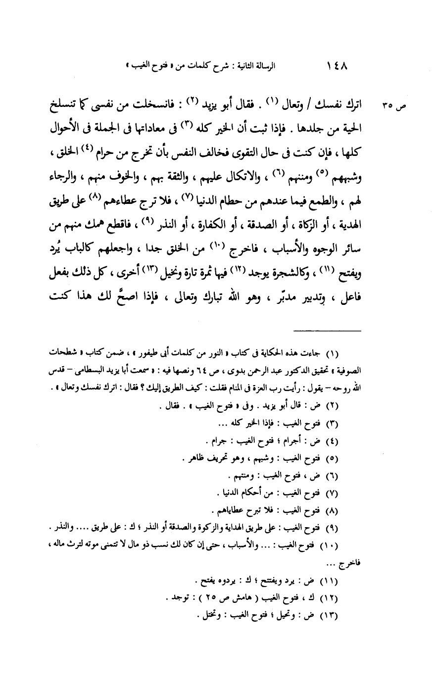 اترك نَفسك وتعال قَالَ أَبُو يزِيد: فانسلخت من نَفسِي كَمَا تنسلخ الْحَيَّة من جلدهَا. فَإِذا ثَبت أَن الْخَيْر كُله فِي معاداتها فِي الْجُمْلَة فِي الْأَحْوَال كلهَا فَإِن كنت فِي حَال التَّقْوَى فَخَالف النَّفس بِأَن تخرج من حرَام الْخلق وشبههم ومننهم والاتكال عَلَيْهِم والثقة بهم وَالْخَوْف مِنْهُم؛ والرجاء لَهُم والطمع فِيمَا عِنْدهم من حطام الدُّنْيَا فَلَا ترج عطاءهم على طَرِيق الْهَدِيَّة أَو الزَّكَاة أَو الصَّدَقَة أَو الْكَفَّارَة أَو النّذر فاقطع همك مِنْهُم من سَائِر الْوُجُوه والأسباب فَاخْرُج من الْخلق جدا واجعلهم كالباب يُرد وَيفتح وكالشجرة يُوجد فِيهَا ثَمَرَة تَارَة ونخيل أُخْرَى كل ذَلِك بِفعل فَاعل وتدبير مُدبر، وَهُوَ الله تبَارك وَتَعَالَى. فَإِذا اصح لَك هَذَا كنت