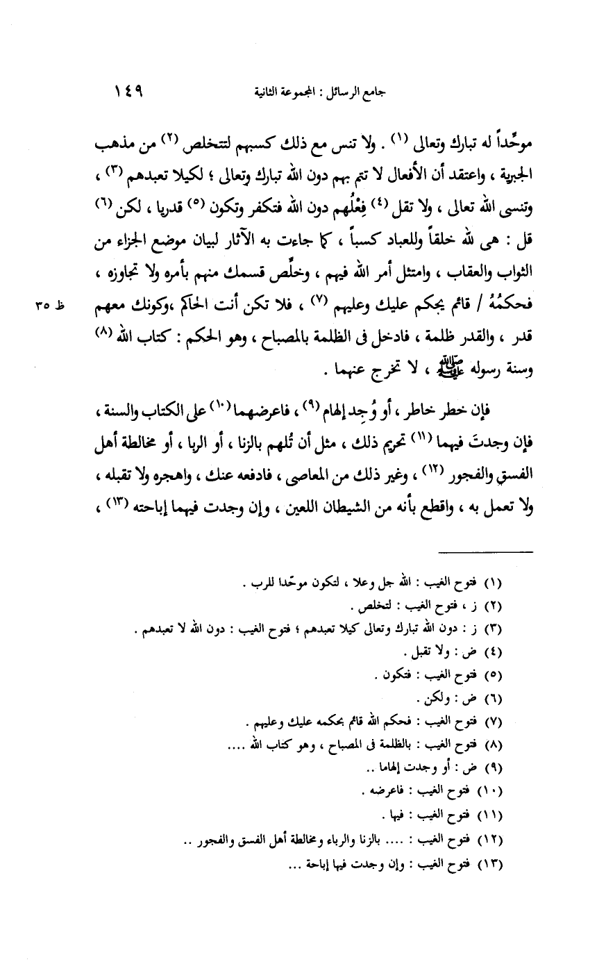 موحدا لَهُ - تبَارك وَتَعَالَى - وَلَا تنس مَعَ ذَلِك كسبهم لتتخلص من مَذْهَب الجبرية وأعتقد أَن الْأَفْعَال لَا تتمّ لَهُم دون الله - تبَارك وَتَعَالَى - لكيلا تعبدهم وتنسى الله تَعَالَى وَلَا تقل فعلهم دون الله فتكفر وَتَكون قدريا. لَكِن قل: هِيَ لله خلقا وللعباد كسبا. كَمَا جَاءَت بِهِ الْآثَار لبَيَان مَوضِع الْجَزَاء من الثَّوَاب وَالْعِقَاب، وامتثل أَمر الله فيهم وخلص قسمك مِنْهُم بأَمْره وَلَا تجاوزه فَحكمه قَائِم يحكم عَلَيْك وَعَلَيْهِم فَلَا تكن أَنْت الْحَاكِم وكونك مَعَهم قدر وَالْقدر ظلمَة فَادْخُلْ فِي الظلمَة بِالْمِصْبَاحِ وَهُوَ " الحكم ": كتاب الله وَسنة رَسُوله صلى الله عَلَيْهِ وَسلم لَا تخرج عَنْهُمَا.