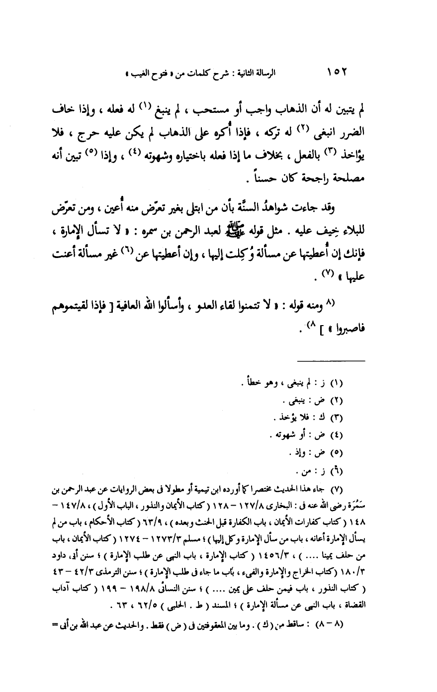 وَقد جَاءَت شَوَاهِد السّنة: بِأَن من ابْتُلِيَ بِغَيْر تعرض مِنْهُ أعين، وَمن تعرض للبلاء خيف عَلَيْهِ. مثل قَوْله صلى الله عَلَيْهِ وَسلم لعبد الرَّحْمَن بن سَمُرَة " {لَا تسْأَل الْإِمَارَة فَإنَّك إِن أعطيتهَا عَن مَسْأَلَة وكلت إِلَيْهَا وَإِن أعطيتهَا عَن غير مَسْأَلَة أعنت عَلَيْهَا} ".