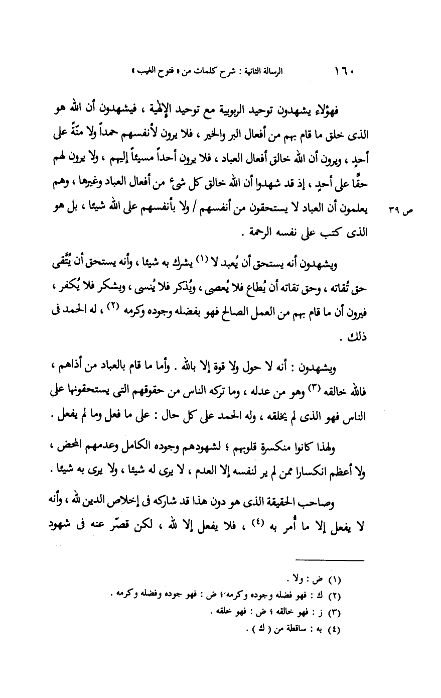 فَهَؤُلَاءِ يشْهدُونَ تَوْحِيد الربوبية مَعَ تَوْحِيد الإلهية فَيَشْهَدُونَ أَن الله هُوَ الَّذِي خلق مَا قَامَ بهم من أَفعَال الْبر وَالْخَيْر فَلَا يرَوْنَ لأَنْفُسِهِمْ حمدا وَلَا منَّة على أحد، ويرون أَن الله خَالق أَفعَال الْعباد فَلَا يرَوْنَ أحدا مسيئا إِلَيْهِم وَلَا يرَوْنَ لَهُم حَقًا على أحد إِذْ قد شهدُوا أَن الله خَالق كل شَيْء من أَفعَال الْعباد وَغَيرهَا وهم يعلمُونَ أَن الْعباد لَا يسْتَحقُّونَ من أنفسهم وَلَا بِأَنْفسِهِم على الله شَيْئا بل هُوَ الَّذِي كتب على نَفسه الرَّحْمَة.