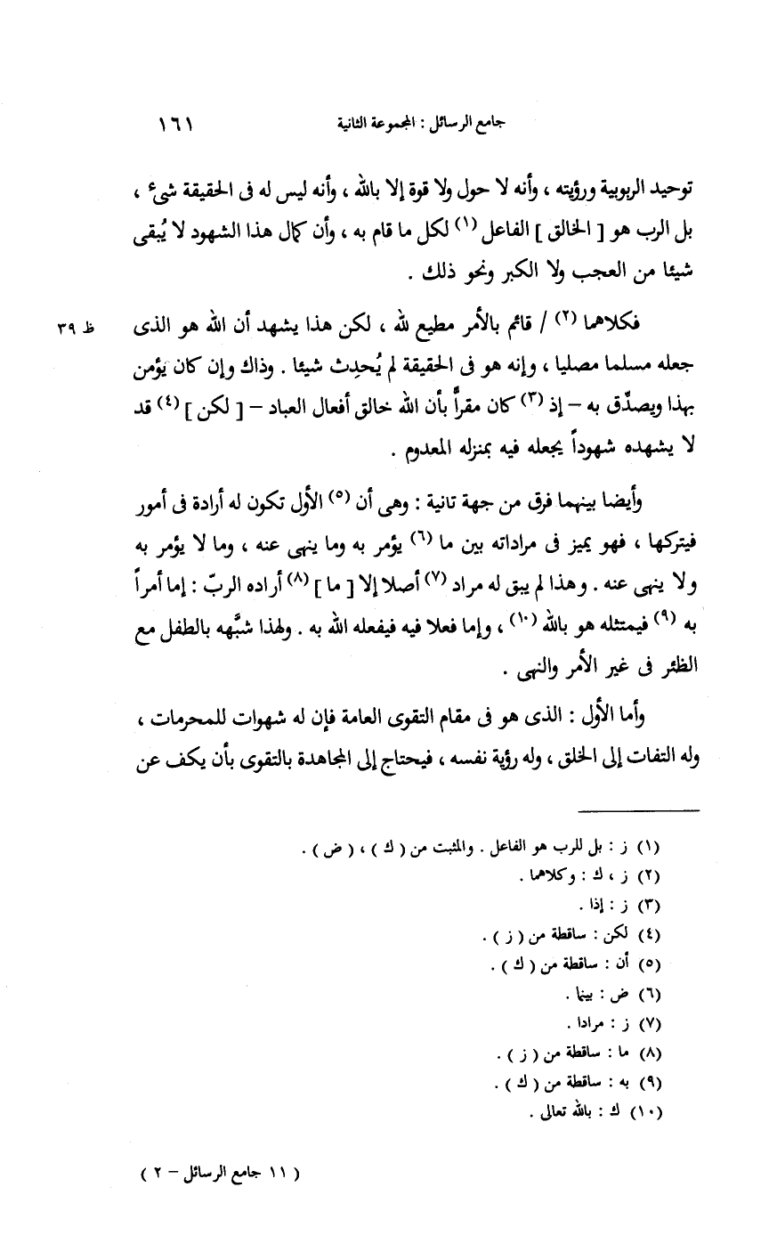 فكلاهما قَائِم بِالْأَمر مُطِيع لله لَكِن هَذَا يشْهد أَن الله هُوَ الَّذِي جعله مُسلما مُصَليا وَأَنه فِي الْحَقِيقَة لم يحدث شَيْئا، وَذَاكَ وَإِن كَانَ يُؤمن بِهَذَا وَيصدق بِهِ إِذْ كَانَ مقرا بِأَن الله خَالق أَفعَال الْعباد؛ لَكِن قد لَا يشهده شُهُودًا يَجعله فِيهِ بِمَنْزِلَة الْمَعْدُوم.