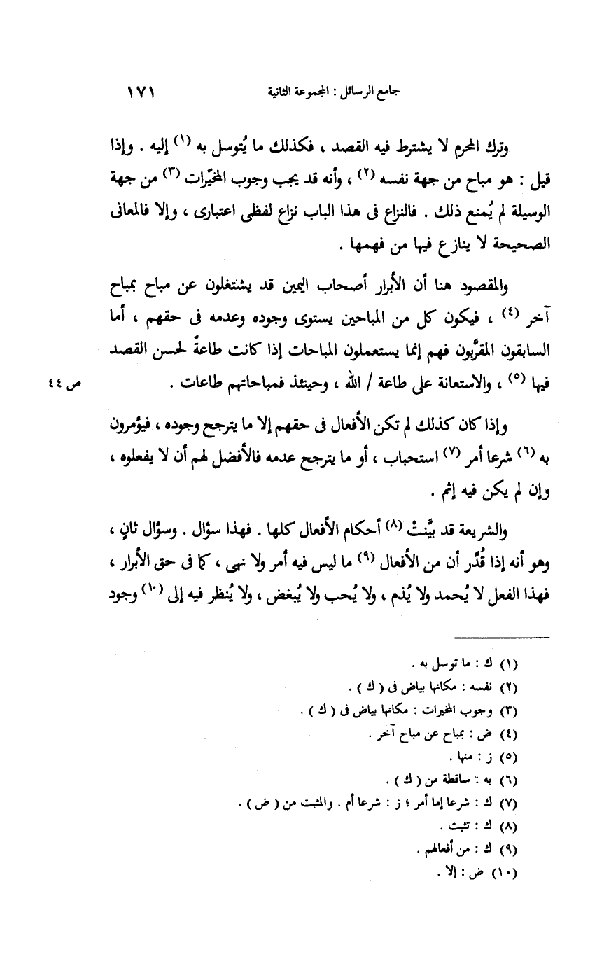 والشريعة قد بيّنت أَحْكَام الْأَفْعَال كلهَا فَهَذَا " سُؤال ". و " سُؤال ثَان " وَهُوَ أَنه إِذا قدر أَن من الْأَفْعَال مَا لَيْسَ فِيهِ أَمر وَلَا نهي كَمَا فِي حق الْأَبْرَار فَهَذَا الْفِعْل لَا يحمد وَلَا يذم وَلَا يحب وَلَا يبغض وَلَا ينظر فِيهِ إِلَى وجود