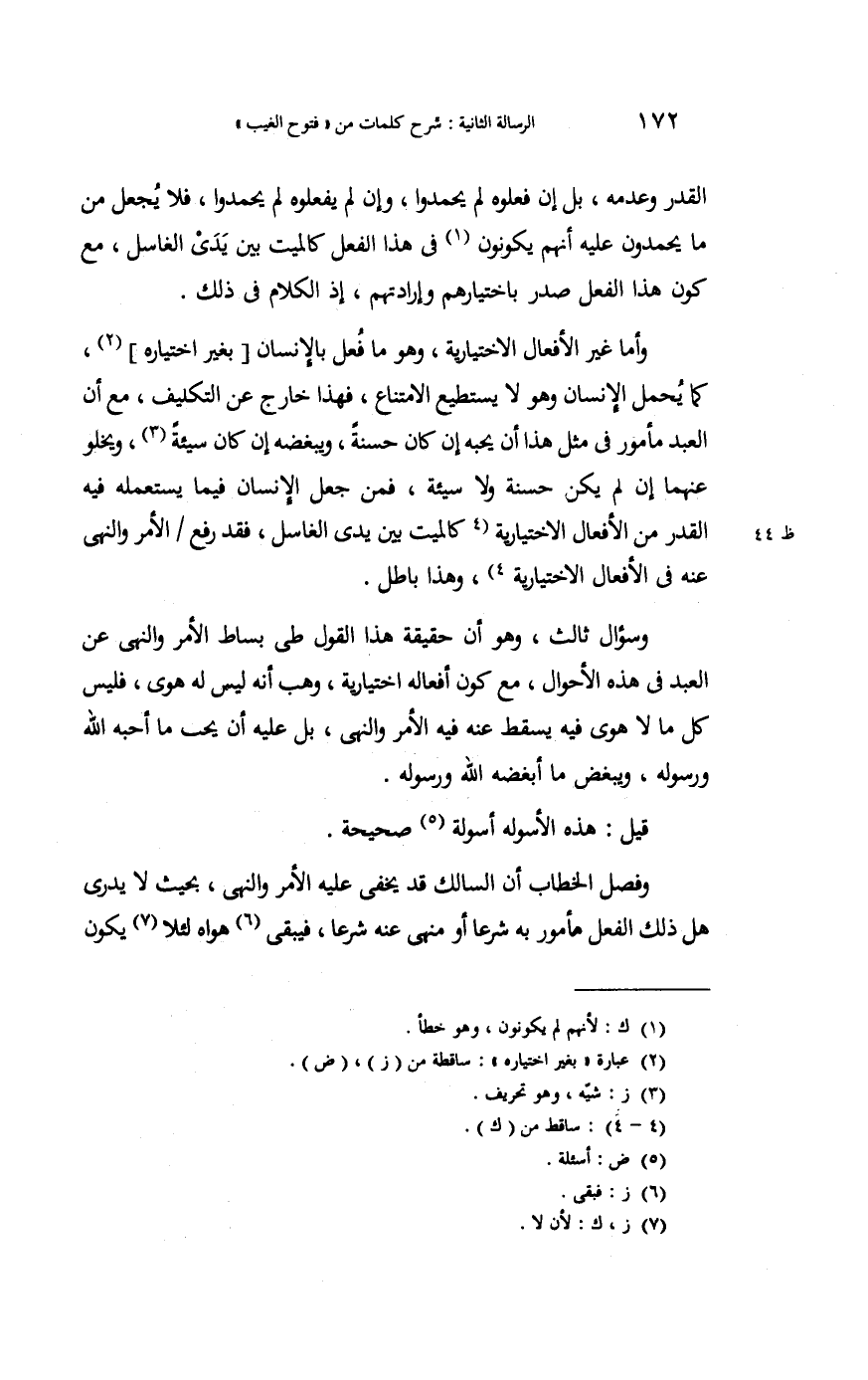 الْقدر وَعَدَمه؛ بل إِن فَعَلُوهُ لم يحْمَدُوا وَإِن لم يفعلوه لم يحْمَدُوا، فَلَا يَجْعَل مِمَّا يحْمَدُونَ عَلَيْهِ أَنهم يكونُونَ فِي هَذَا الْفِعْل كالميت بَين يَدي الْغَاسِل مَعَ كَون هَذَا الْفِعْل صدر باختيارهم وإرادتهم. إِذْ الْكَلَام فِي ذَلِك.
