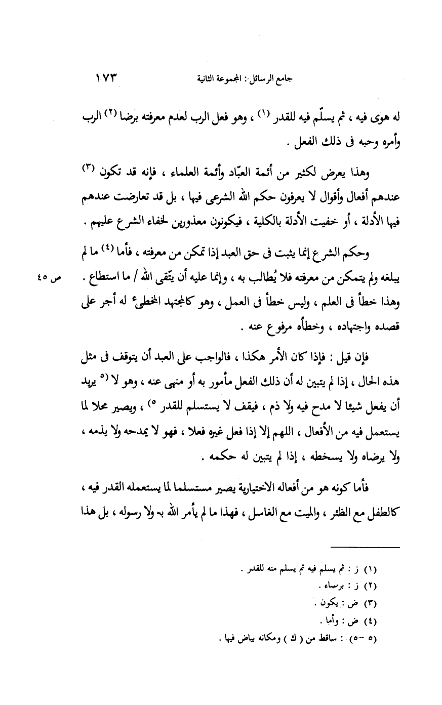 فَإِن قيل: فَإِذا كَانَ الْأَمر هَكَذَا. فَالْوَاجِب على العَبْد أَن يتَوَقَّف فِي مثل هَذِه الْحَال إِذا لم يتَبَيَّن لَهُ أَن ذَلِك الْفِعْل مَأْمُور بِهِ أَو مَنْهِيّ عَنهُ وَهُوَ لَا يُرِيد أَن يفعل شَيْئا لَا مدح فِيهِ وَلَا ذمّ فيقف لَا يستسلم للقدر وَيصير محلا لما يسْتَعْمل فِيهِ من الْأَفْعَال اللَّهُمَّ إِلَّا إِذا فعل غَيره فعلا فَهُوَ لَا يمدحه وَلَا يذمه وَلَا يرضاه وَلَا يسخطه؛ إِذا لم يتَبَيَّن لَهُ حكمه.