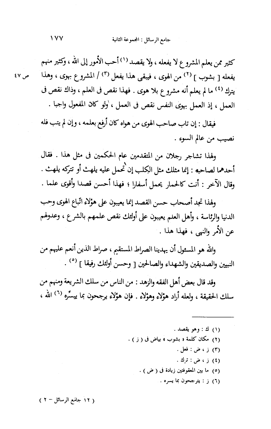 كثير مِمَّن يعلم الْمَشْرُوع لَا يَفْعَله وَلَا يقْصد أحب الْأُمُور إِلَى الله، وَكثير مِنْهُم يَفْعَله بشوب من الْهوى فَيبقى هَذَا يفعل الْمَشْرُوع بهوى، وَهَذَا يتْرك مَا لم يعلم أَنه مَشْرُوع بِلَا هوى. فَهَذَا نقص فِي الْعلم، وَذَاكَ نقص فِي الْعَمَل؛ إِذْ الْعَمَل بهوى النَّفس نقص فِي الْعَمَل وَلَو كَانَ الْمَفْعُول وَاجِبا.