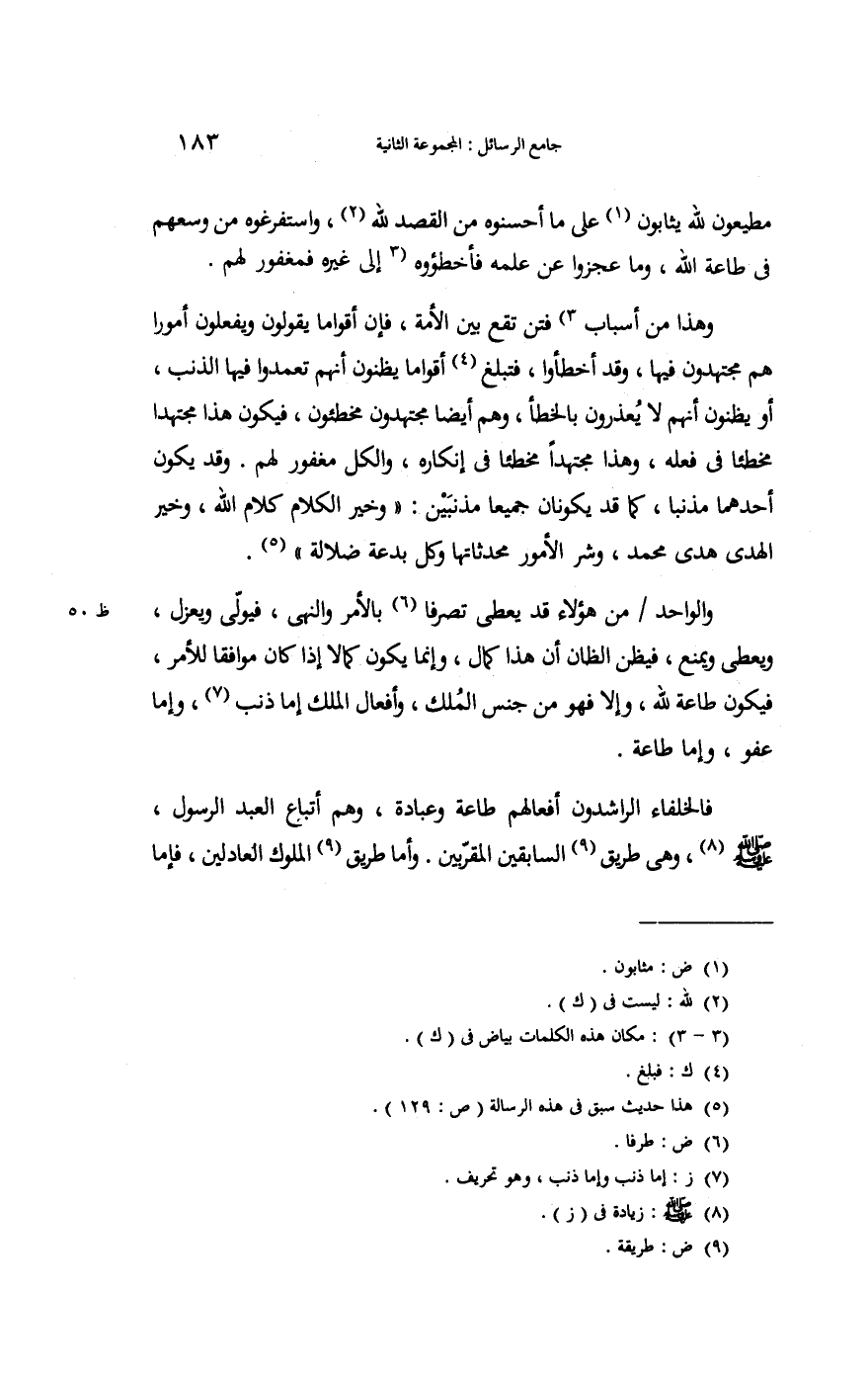 فالخلفاء الراشدون أفعالهم طَاعَة وَعبادَة وهم أَتبَاع العَبْد الرَّسُول صلى الله عَلَيْهِ وَسلم، وَهِي طَرِيق السَّابِقين المقربين. وَأما طَرِيق الْمُلُوك العادلين فإمَّا