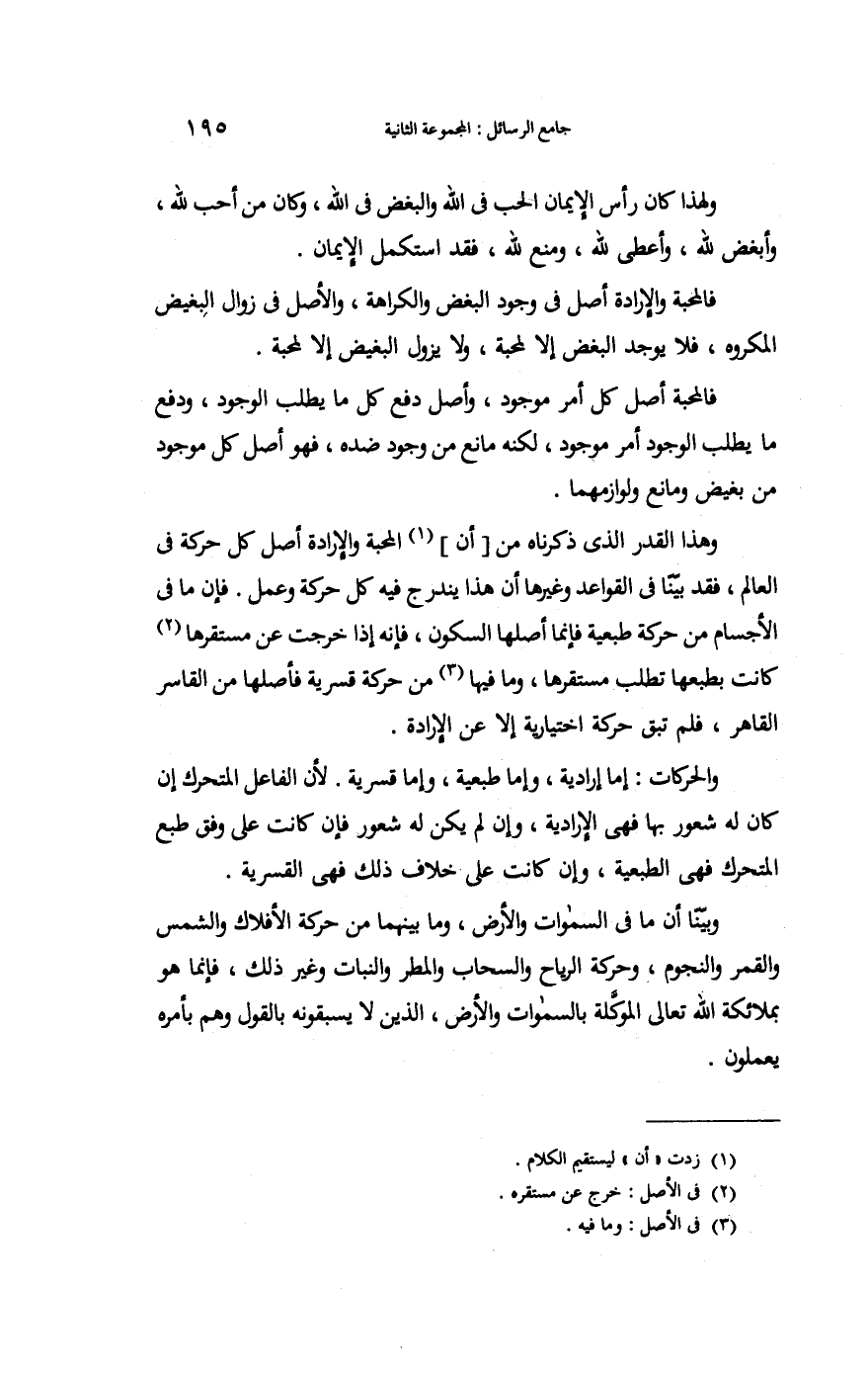 وَهَذَا الْقدر الَّذِي ذَكرْنَاهُ من أَن الْمحبَّة والإرادة اصل كل حَرَكَة فِي الْعَالم فقد بَينا فِي الْقَوَاعِد وَغَيرهَا أَن هَذَا ينْدَرج فِيهِ كل حَرَكَة وَعمل فَإِن مَا فِي الْأَجْسَام من حركه طبعية فَإِنَّمَا أَصْلهَا السّكُون فَإِنَّهُ إِذا خرجت عَن مستقرها كَانَت بطبعها تطلب مستقرها وَمَا فِيهَا من حَرَكَة قسرية فأصلها من القاسر القاهر فَلم تبْق حَرَكَة اختيارية إِلَّا عَن الْإِرَادَة