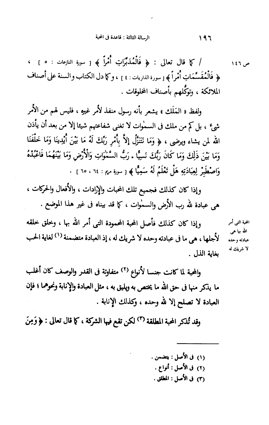 وَلَفظ الْملك يشْعر بِأَنَّهُ رَسُول منفذ لأمر غَيره فَلَيْسَ لَهُم من الْأَمر شئ بل كم من ملك فِي السَّمَوَات لَا تغني شفاعتهم شَيْئا إِلَّا من بعد أَن يَأْذَن الله لمن يَشَاء ويرضى ووَمَا نَتَنَزَّل إِلَّا بِأَمْر رَبك لَهُ مَا بَين أَيْدِينَا وَمَا خلفنا وَمَا بَين ذَلِك وَمَا كَانَ رَبك نسيا رب السَّمَوَات وَالْأَرْض وَمَا بَينهمَا فاعبده واصطبر لعبادته هَل تعلم لَهُ سميا وَإِذا كَانَ كَذَلِك فَجَمِيع تِلْكَ المحبات والإرادات وَالْأَفْعَال والحركات هِيَ عبَادَة لله رب الأَرْض وَالسَّمَوَات كَمَا قد بَيناهُ فِي غير هَذَا الْموضع