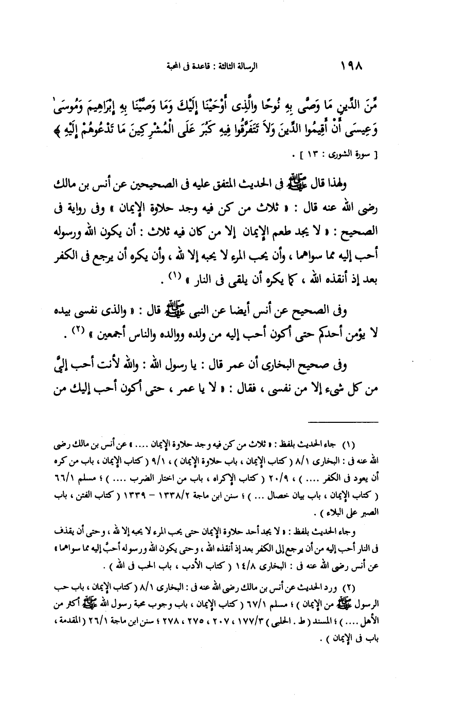 وَلِهَذَا قَالَ فِي الحَدِيث الْمُتَّفق عَلَيْهِ فِي الصَّحِيحَيْنِ عَن أنس بن مَالك رَضِي الله عَنهُ قَالَ ثَلَاث من كن فِيهِ وجد حلاوة الْإِيمَان وَفِي رِوَايَة فِي الصَّحِيح لَا يجد طعم الْإِيمَان إِلَّا من كَانَ فِيهِ ثَلَاث أَن يكون الله وَرَسُوله أحب إِلَيْهِ مِمَّا سواهُمَا وَأَن يحب الْمَرْء لَا يُحِبهُ إِلَّا لله وَأَن يكره أَن يرجع فِي الْكفْر بعد إِذْ أنقذه الله كَمَا يكره أَن يلقِي فِي النَّار
