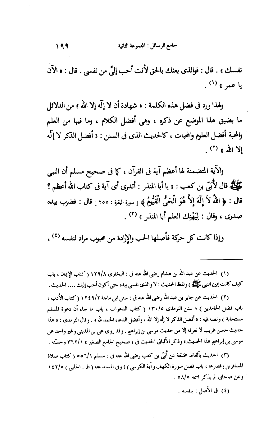وَلِهَذَا ورد فِي فضل هَذِه الْكَلِمَة شَهَادَة أَن لَا إِلَه إِلَّا الله من الدَّلَائِل مَا يضيق هَذَا الْموضع عَن ذكره وهى أفضل الْكَلَام وَمَا فِيهَا من الْعلم والمحبة أفضل الْعُلُوم والمحبات كالحديث الَّذِي فِي السّنَن أفضل الذّكر لَا إِلَه أَلا الله