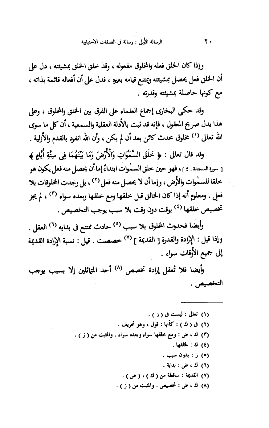 و" أَيْضا " فحدوث الْمَخْلُوق بِلَا سَبَب حَادث مُمْتَنع فِي بدايه الْعقل وَإِذا قيل: الْإِرَادَة وَالْقُدْرَة الْقَدِيمَة خصصت. قيل: نِسْبَة الْإِرَادَة الْقَدِيمَة إِلَى جَمِيع الْأَوْقَات سَوَاء.