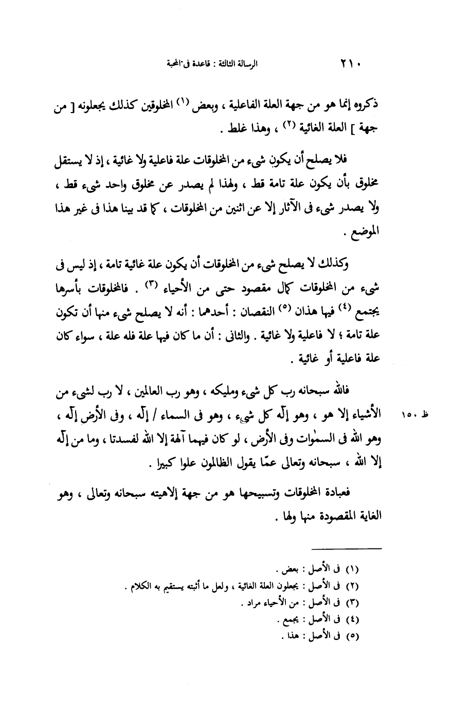 وَكَذَلِكَ لَا يصلح شَيْء من الْمَخْلُوقَات أَن يكون عِلّة غائية تَامَّة إِذْ لَيْسَ فِي شَيْء من الْمَخْلُوقَات كَمَال مَقْصُود حَتَّى من الْأَحْيَاء فالمخلوقات بأسرها يجْتَمع فِيهَا هَذَانِ النُّقْصَان أَحدهمَا أَنه لَا يصلح شَيْء مِنْهَا أَن تكون عِلّة تَامَّة لَا فاعلية وَلَا غائية وَالثَّانِي أَن مَا كَانَ فِيهَا عِلّة فَلهُ عِلّة سَوَاء كَانَ عِلّة فاعلية أَو غائية