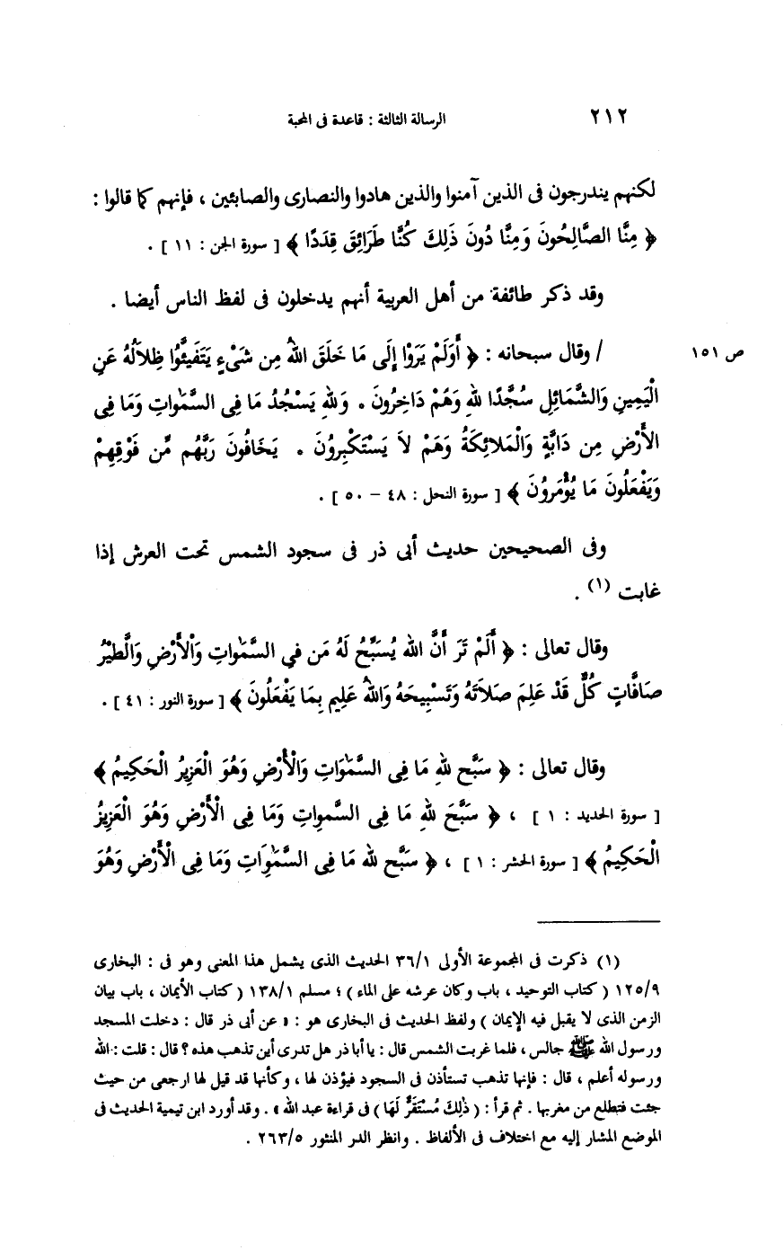 وَقَالَ تَعَالَى ألم تَرَ أَن الله يسبح لَهُ من فِي السَّمَوَات وَالْأَرْض وَالطير صافات كل قد علم صلَاته وتسبيحه وَالله عليم بِمَا يَفْعَلُونَ وَقَالَ تَعَالَى سبح لله مَا فِي السَّمَوَات وَالْأَرْض وَهُوَ الْعَزِيز الْحَكِيم سبح لله مَا فِي السَّمَوَات وَمَا فِي الأَرْض وَهُوَ الْعَزِيز الْحَكِيم سبح لله مَا فِي السَّمَوَات وَمَا فِي الأَرْض وَهُوَ