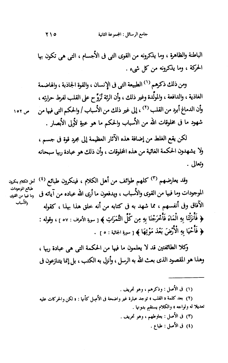وَقد يعارضهم كلهم طوائف من أهل الْكَلَام فينكرون طبائع الموجودات وَمَا فِيهَا من الْقوي والأسباب ويدفعون مَا أرى الله عباده من آيَاته فِي الْآفَاق وَفِي أنفسهم مِمَّا شهد بِهِ فِي كِتَابه من أَنه خلق هَذَا بِهَذَا كَقَوْلِه فأنزلنا بِهِ المَاء فأخرجنا بِهِ من كل الثمرات وَقَوله فأحيا بِهِ الأَرْض بعد مَوتهَا