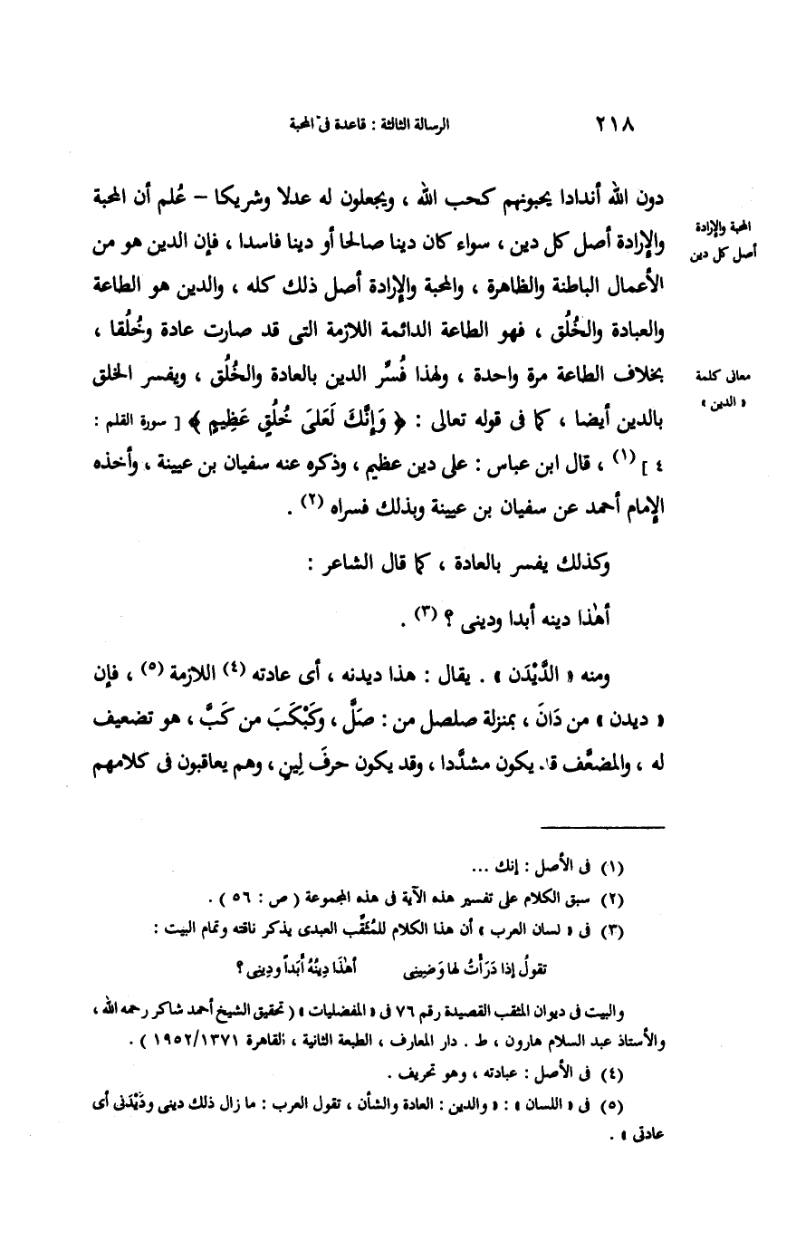 دون الله أندادا يحبونهم كحب الله ويجعلون لَهُ عدلا وشريكا علم أَن الْمحبَّة والإرادة أصل كل دين سَوَاء كَانَ دينا صَالحا أَو دينا فَاسِدا فَإِن الدَّين هُوَ من الْأَعْمَال الْبَاطِنَة وَالظَّاهِرَة والمحبة والإرادة أصل ذَلِك كُله وَالدّين هُوَ الطَّاعَة وَالْعِبَادَة والخلق فَهُوَ الطَّاعَة الدائمة اللَّازِمَة الَّتِي قد