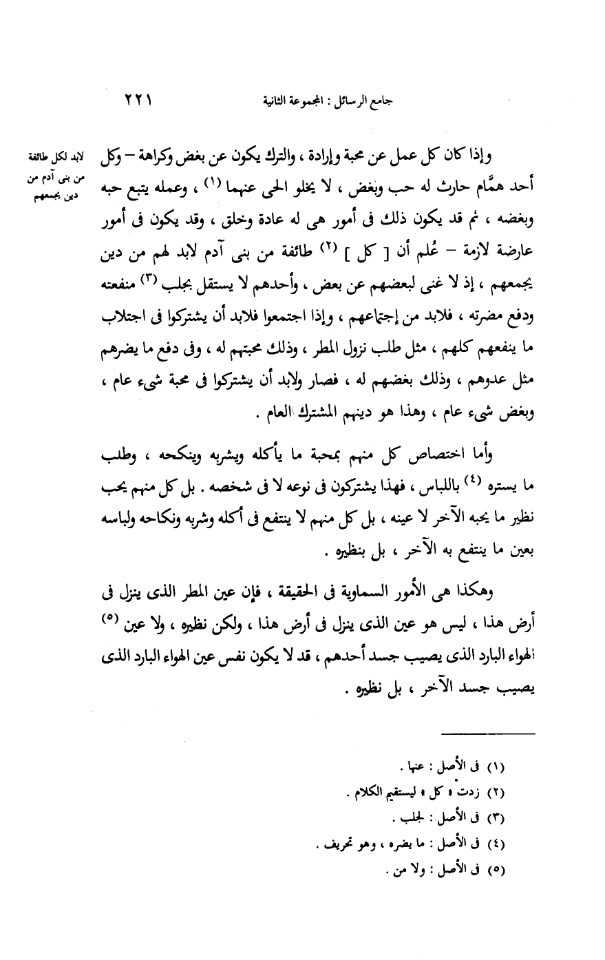 وَإِذا كَانَ كل عمل عَن محبَّة وَإِرَادَة وَالتّرْك يكون عَن بغض وَكَرَاهَة وكل أحد همام حَارِث لَهُ حب وبغض لَا يَخْلُو الْحَيّ عَنْهُمَا وَعَمله يتبع حبه وبغضه ثمَّ قد يكون ذَلِك فِي أُمُور هِيَ لَهُ عَادَة وَخلق وَقد يكون فِي أُمُور عارضة لَازِمَة علم أَن كل طَائِفَة من بني آدم لَا بُد لَهُم من دين يجمعهُمْ إِذْ لَا غَنِي لبَعْضهِم عَن بعض وأحدهم لَا يسْتَقلّ بجلب منفعَته وَدفع مضرته فَلَا بُد من اجْتِمَاعهم وَإِذا اجْتَمعُوا فَلَا بُد أَن يشتركوا فِي اجتلاب مَا يَنْفَعهُمْ كلهم مثل طلب نزُول الْمَطَر وَذَلِكَ محبتهم لَهُ وَفِي دفع مَا يضرهم مثل عدوهم وَذَلِكَ بغضهم لَهُ فَصَارَ وَلَا بُد أَن يشتركوا فِي محبَّة شَيْء عَام وبغض شَيْء عَام وَهَذَا هُوَ دينهم الْمُشْتَرك الْعَام