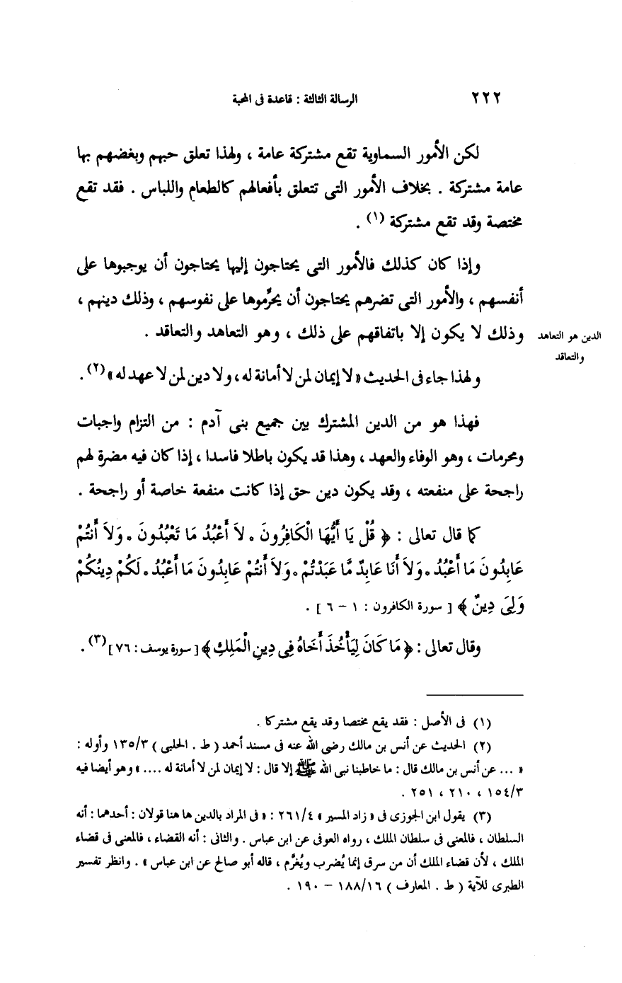 فَهَذَا هُوَ من الدَّين الْمُشْتَرك بَين جَمِيع بني آدم من الْتِزَام وَاجِبَات ومحرمات وَهُوَ الْوَفَاء والعهد وَهَذَا قد يكون بَاطِلا فَاسِدا إِذا كَانَ فِيهِ مضرَّة لَهُم راجحة على منفعَته وَقد يكون دين حق إِذا كَانَت مَنْفَعَة خَاصَّة أَو راجحة