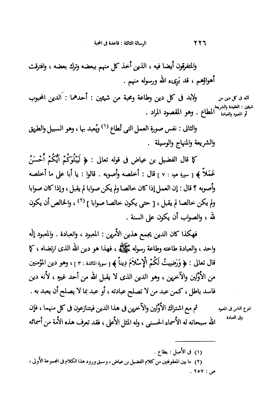وَلَا بُد فِي كل دين وَطَاعَة ومحبة من شَيْئَيْنِ أَحدهمَا الدَّين المحبوب المطاع وَهُوَ الْمَقْصُود المُرَاد