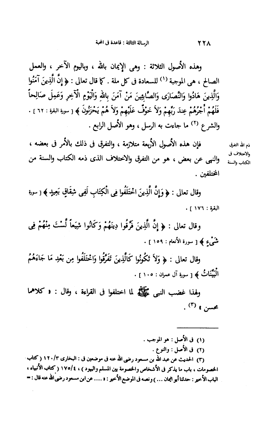 وَهَذِه الْأُصُول الثَّلَاثَة وَهِي الْإِيمَان بِاللَّه وباليوم الآخر وَالْعَمَل الصَّالح هِيَ الْمُوجبَة للسعادة فِي كل مِلَّة كَمَا قَالَ تَعَالَى إِن الَّذين آمنُوا وَالَّذين هادوا وَالنَّصَارَى وَالصَّابِئِينَ من آمن بِاللَّه وَالْيَوْم الآخر وَعمل صَالحا فَلهم أجرهم عِنْد رَبهم وَلَا خوف عَلَيْهِم وَلَا هم يَحْزَنُونَ وَالشَّرْع مَا جَاءَت بِهِ الرُّسُل وَهُوَ الأَصْل الرَّابِع