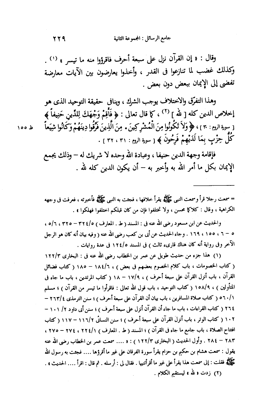 وَقَالَ إِن الْقُرْآن نزل على سَبْعَة أحرف فاقرؤوا مِنْهُ مَا تيَسّر وَكَذَلِكَ غضب لما تنازعوا فِي الْقدر وَأخذُوا يعارضون بَين الْآيَات مُعَارضَة تُفْضِي إِلَى الْإِيمَان بِبَعْض دون بعض