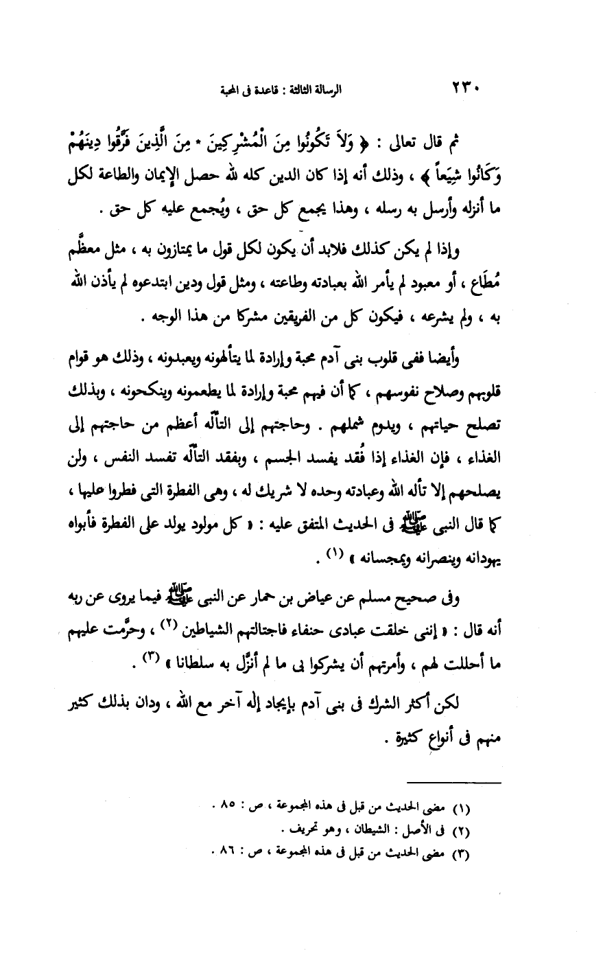 وَأَيْضًا فَفِي قُلُوب بني آدم محبَّة وَإِرَادَة لما يتألهونه ويعبدونه وَذَلِكَ هُوَ قوام قُلُوبهم وَصَلَاح نُفُوسهم كَمَا أَن فيهم محبَّة وَإِرَادَة لما يطعمونه وينكحونه وَبِذَلِك تصلح حياتهم ويدوم شملهم وحاجتهم إِلَى التأله أعظم من حَاجتهم إِلَى الْغذَاء فَإِن الْغذَاء إِذا فقد يفْسد الْجِسْم وبفقد التأله تفْسد النَّفس وَلنْ يصلحهم إِلَّا تأله الله وعبادته وَحده لَا شريك لَهُ وَهِي الْفطْرَة الَّتِي فطروا عَلَيْهَا كَمَا قَالَ النَّبِي فِي الحَدِيث الْمُتَّفق عَلَيْهِ كل مَوْلُود يُولد على الْفطْرَة فَأَبَوَاهُ يُهَوِّدَانِهِ وَيُنَصِّرَانِهِ ويمجسانه