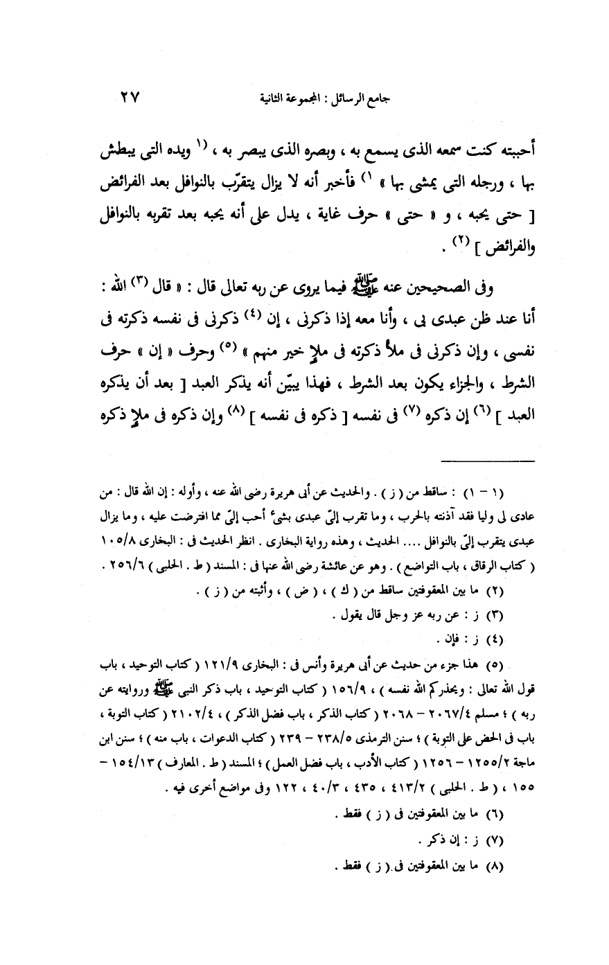 أحببته كنت سَمعه الَّذِي يسمع بِهِ؛ وبصره الَّذِي يبصر بِهِ وَيَده الَّتِي يبطش بهَا وَرجله الَّتِي يمشي بهَا} " فَأخْبر أَنه لَا يزَال يتَقرَّب بالنوافل بعد الْفَرَائِض حَتَّى يُحِبهُ، و "حَتَّى " حرف غَايَة، يدل على أَنه يُحِبهُ بعد تقربه بالنوافل والفرائض.